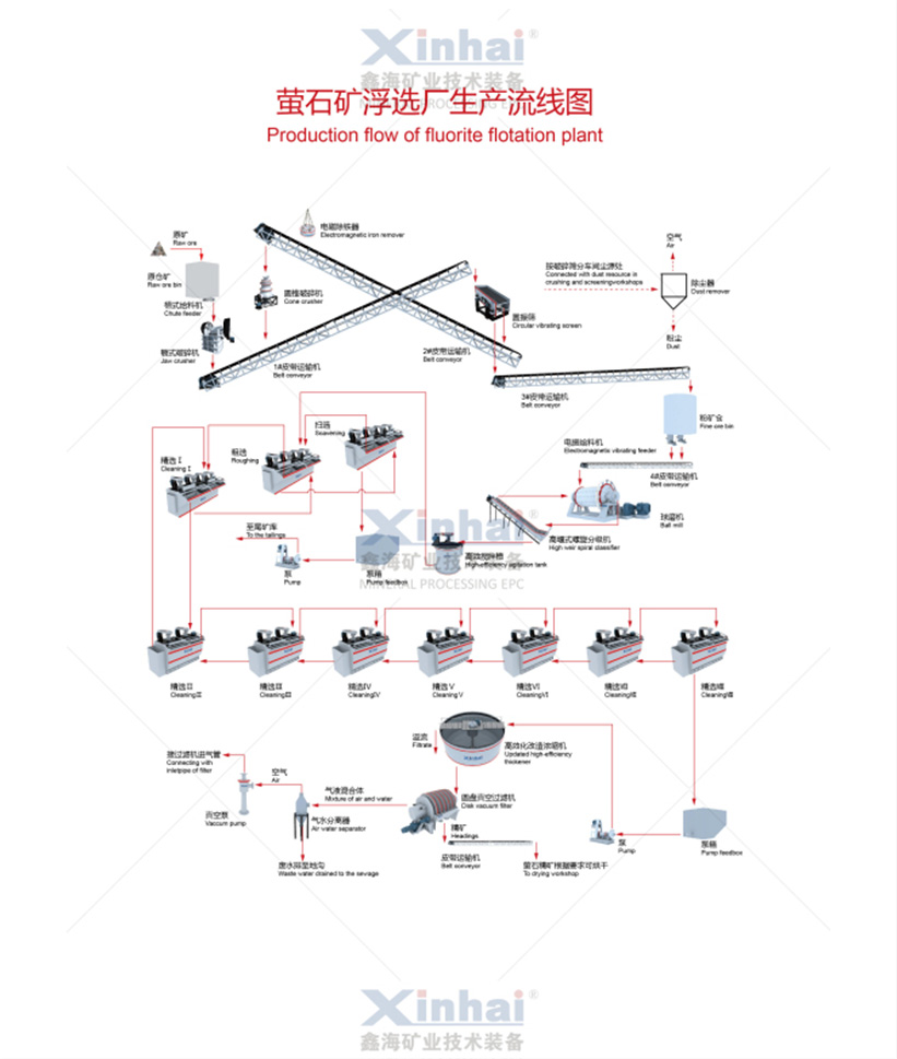 浮选工艺,是鑫海较重要的选矿方法之一,鑫海浮选工艺应用的流程中,均为:原矿石—>振动给料机(槽式给料机)—>PE颚式破碎机(粗破)—>圆锥破碎机(细破)—>振动筛—>料仓—>摆式给料机(电磁振动给料机)—>球磨机—>螺旋分级机(高频筛)—>搅拌桶—>浮选机—>湿精矿—>浓缩机—>压滤机(过滤机)—>烘干机—>干精粉—>摆式给料机(电磁振动给料机)—>球磨机—>螺旋分级机(高频筛)